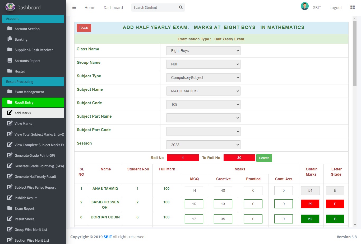 Board/group policy অনুযায়ী GPA, letter grade এবং fail logic auto calculate।